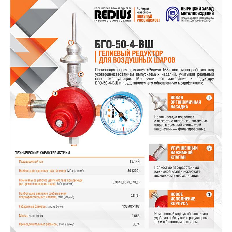 Редуктор гелиевый БГО-50-4-ВШ, предназначен для понижения давления газа, поступающего из баллона и наполнения гелием воздушных шаров.