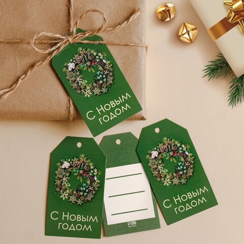 Шильдик, С Новым Годом, Еловый венок, Зеленый, 5*9 см, 10 шт.
