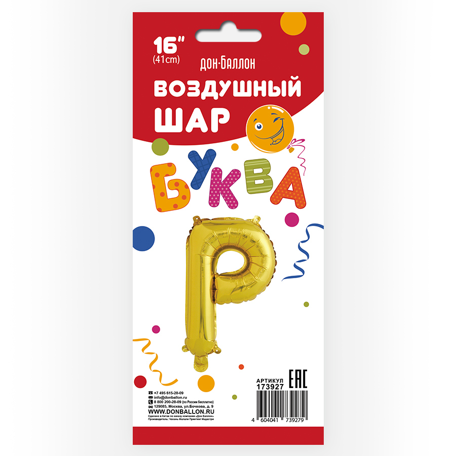 К 16''/41 см Мини-буква Золото "Р", с клапаном, 1 шт. в упаковке