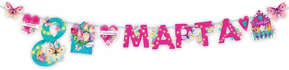 Гирлянда-буквы, "С 8 Марта, Пожелания, Бабочки", 1 шт.