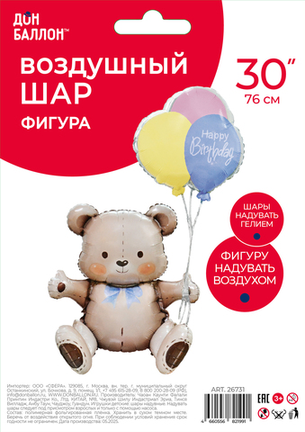К Фигура, Мишка на День Рождения, 30''/76 см, 1 шт.
