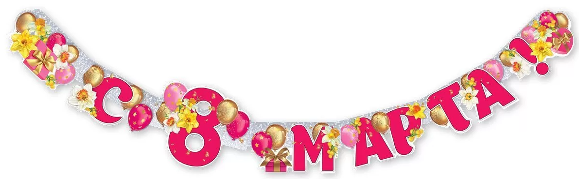 Гирлянда-буквы "С 8 Марта, Малиновый, Шары и подарки", 1 шт.