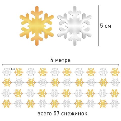 Гирлянда на нитях, "Снежинки", Металлик, Золото/Серебро, 5 см*4 м, 1 шт.