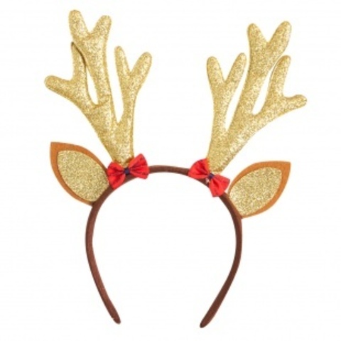 Ободок, "Оленьи рожки с ушками и красными бантиками", Золото, с блестками, 1 шт.