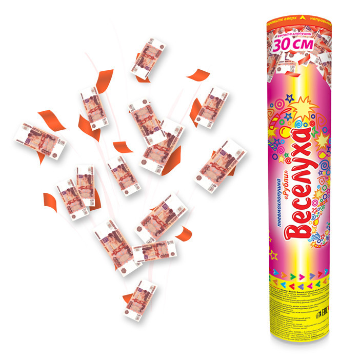 Пневмохлопушка Рубли (деньги) украсит любое торжество – корпоративный праздник, юбилей или свадьбу. Фонтан из конфетти в виде рублевых купюр и бумажных стримеров удивит и порадует всех участников Вашего торжества.