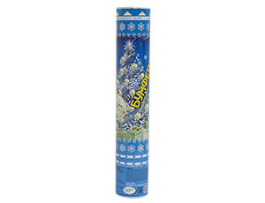 Пневматическое устройство, аналог хлопушки, абсолютно безопасное, предназначено для использования в помещении и на улице, дальность выстрела 6-8 м. Корпус хлопушки состоит из двух частей: пневматического баллона со сжатым воздухом и картонного цилиндра с наполнителем. Баллон изготовлен из металла, надежен и безопасен при хранении и в использовании, обладает высокой прочностью, чтобы выдержать давление воздуха. Наполнитель: фольгированные серебряные снежинки и елочки, синий бумажный серпантин.