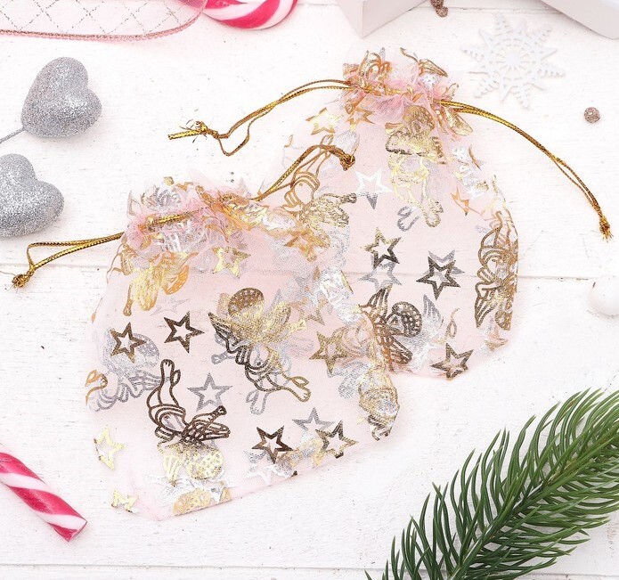 Мешочек органза, "Ангелы", Розовый с золотом, 10*12 см, 5 шт.