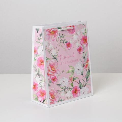 Пакет подарочный S вертикальный, Ламинированный, "Самой прекрасной", Розовый, 21*25*8 см (Д*В*Ш)