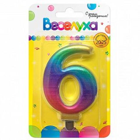 Свеча тортовая, "Радуга", цифра "6", металлизированная, 9 см, 1 шт.