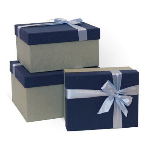 Коробка одиночная, Прямоугольник, с бантом тиснение Рогожка, Синий-серый, 23*19*13 см, 1 шт.