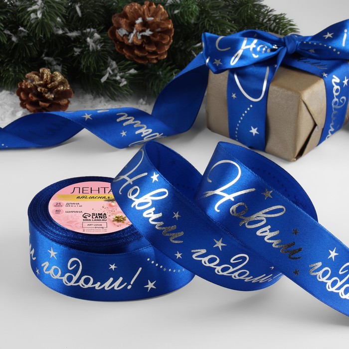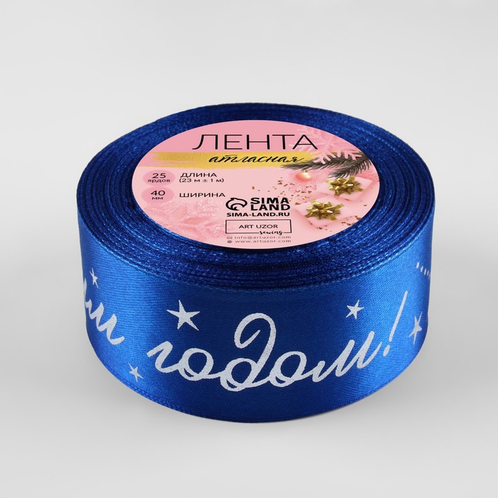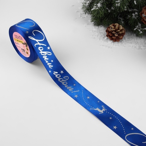 Лента Атласная (4см*23±1м), «С Новым годом!», Синяя, 1 шт.