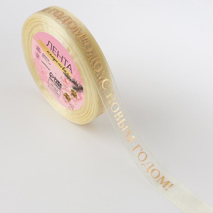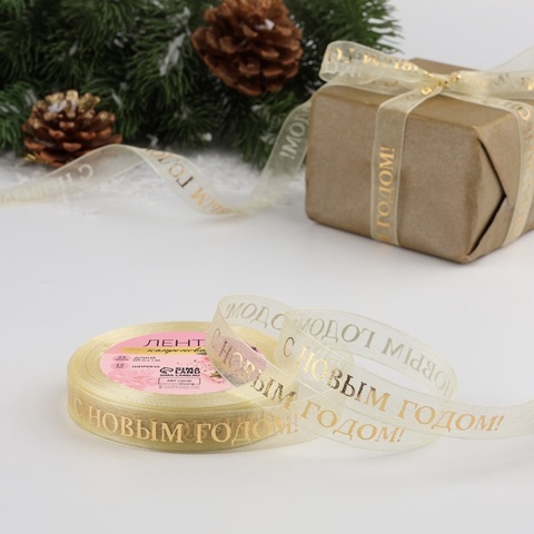 Лента органза (1,5 см*23±1 м), с тиснением «С Новым годом», Бежевый