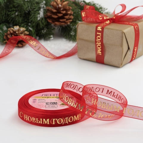 Лента органза (1,5 см*23±1 м), с тиснением «С Новым годом», Красный