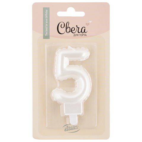 Свеча-цифра, "5" Воздушный шарик, Жемчужный, Перламутр, 4,5*7 + 1 см, 1 шт